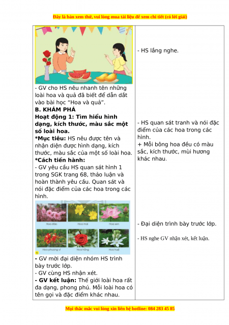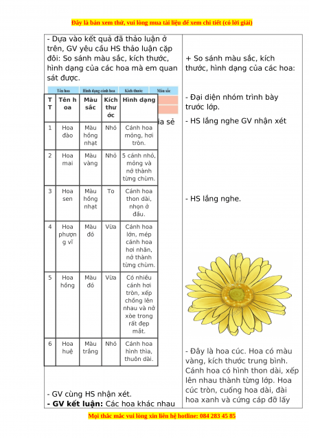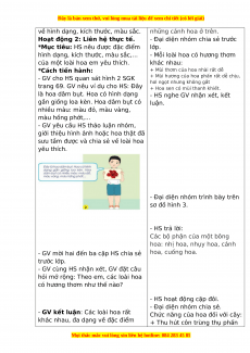 H loớap. Màu Nhỏ Cánh hoa đào hồng mỏng, hơi nhạt tròn. 2 Hoa Màu Nhỏ 5 cánh nhỏ, mai vàng mỏng và nở thành từng chùm. 3 Hoa Màu To Cánh hoa sen hồng thon dài, - HS lắng nghe. nhạt nhọn ở đầu. 4 Hoa Màu Vừa Cánh hoa phượn đỏ lớn, mép g vĩ cánh hoa hơi nhăn, nở thành từng chùm. 5 Hoa Màu Vừa Có nhiều hồng đỏ cánh hơi tròn, xếp chồng lên nhau và nở xòe trong rất đẹp mắt. 6 Hoa Màu Nhỏ Cánh hoa huệ trắng hình thìa,