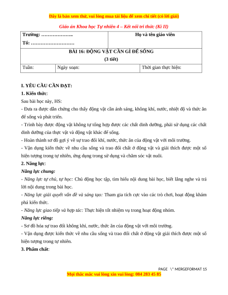 BÀI 16: ĐỘNG VẬT CẦN GÌ ĐỂ SỐNG (3 tiết) Tuần: Ngày soạn: Thời gian thực hiện: I. YÊU CẦU CẦN ĐẠT: 1. Kiến thức: Sau bài học này, HS: