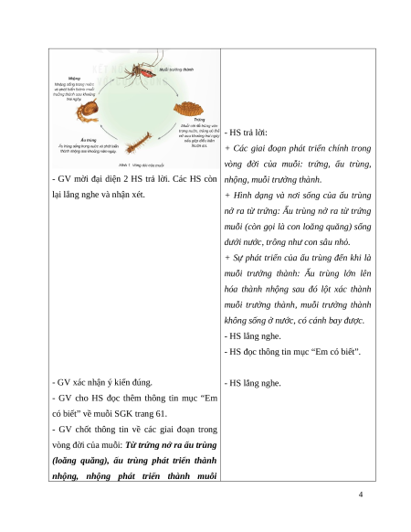 - GV mời đại diện 2 HS trả lời. Các HS còn nhộng, muỗi trưởng thành.