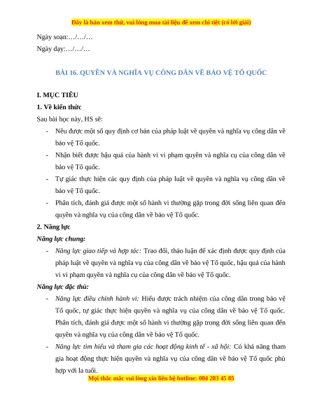 BÀI 16. QUYỀN VÀ NGHĨA VỤ CÔNG DÂN VỀ BẢO VỆ TỔ QUỐC I. MỤC TIÊU 1. Về kiến thức Sau bài học này, HS sẽ: