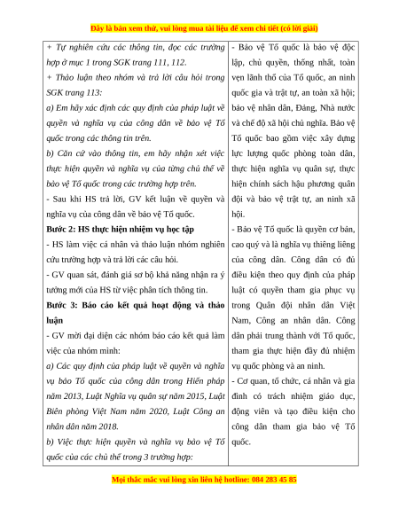 - GV yêu cầu HS thảo luận theo nhóm đôi và giao vụ của công dân về bảo vệ Tổ nhiệm vụ cho HS: quốc