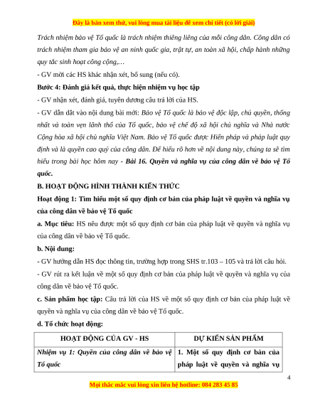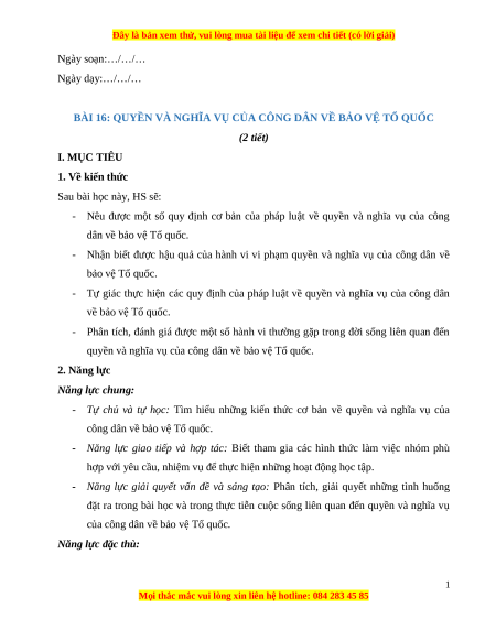 BÀI 16: QUYỀN VÀ NGHĨA VỤ CỦA CÔNG DÂN VỀ BẢO VỆ TỔ QUỐC (2 tiết) I. MỤC TIÊU 1. Về kiến thức Sau bài học này, HS sẽ: