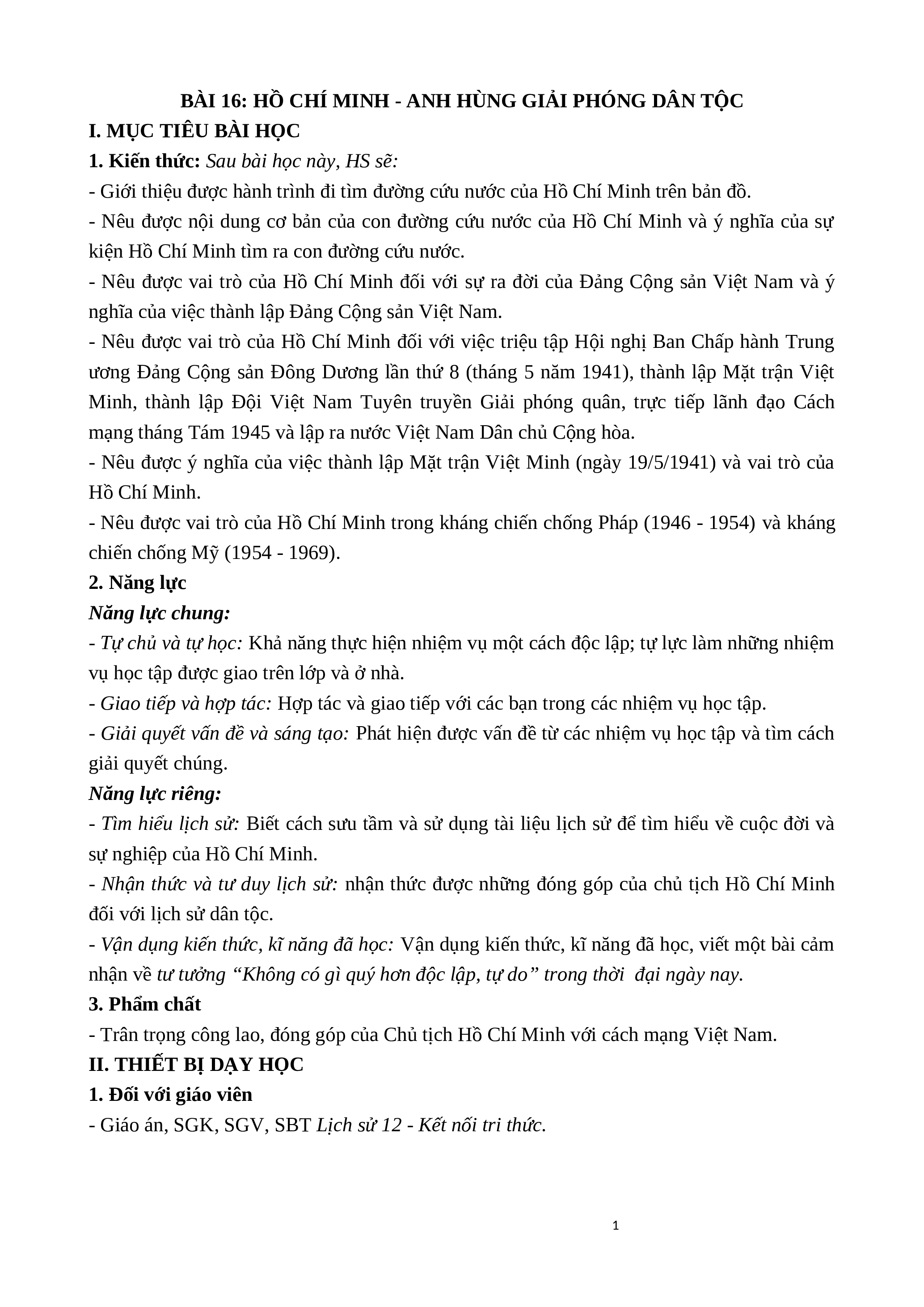 BÀI 16: HỒ CHÍ MINH - ANH HÙNG GIẢI PHÓNG DÂN TỘC I. MỤC TIÊU BÀI HỌC