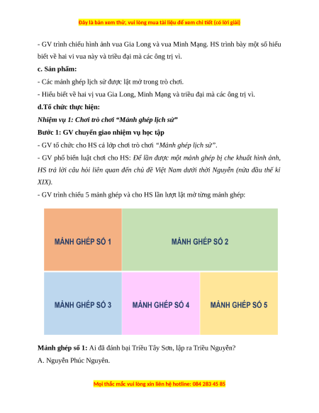 - GV tổ chức cho HS chơi trò chơi “Mảnh ghép lịch sử”. HS trả lời một số câu hỏi
