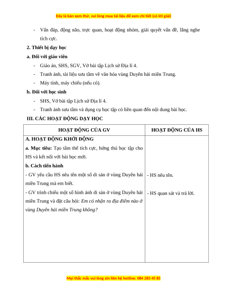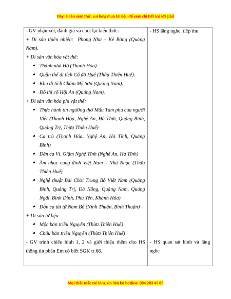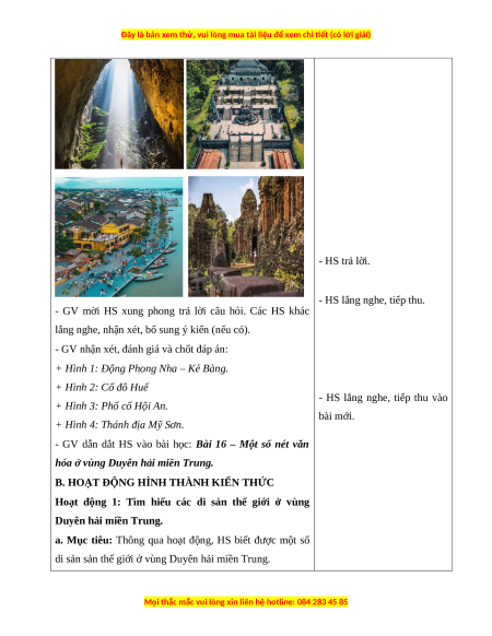 - Nhận thức khoa học Lịch sử và Địa lí: kể được tên các di sản thế giới ở vùng Duyên hải miền Trung.