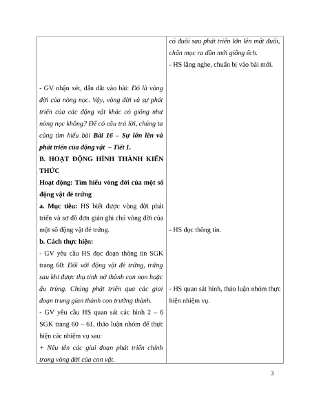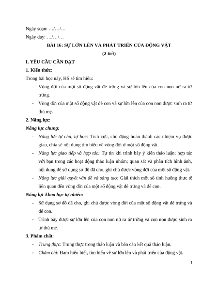 Giáo án Bài 16: Sự lớn lên và phát triển của động vật Khoa học lớp 5 Chân trời sáng tạo