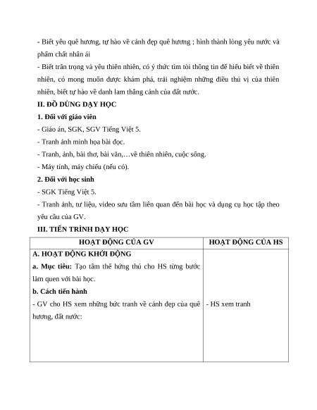 - Biết yêu quê hương, tự hào về cảnh đẹp quê hương ; hình thành lòng yêu nước và phẩm chất nhân ái