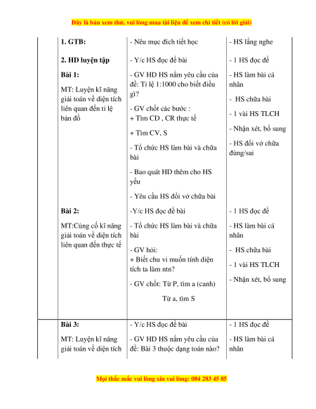 giải toán về diện tích - HS chữa bài liên quan đến tỉ lệ - GV chốt các bước : - 1 vài HS TLCH bản đồ + Tìm CD , CR thực tế - Nhận xét, bổ sung + Tìm CV, S - HS đổi vở chữa
