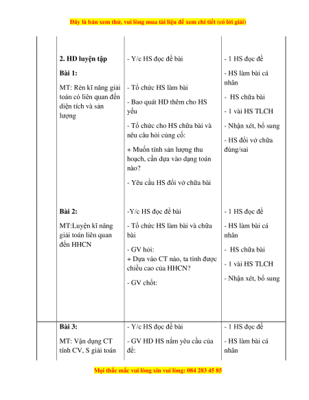 MT: Rèn kĩ năng giải - Tổ chức HS làm bài toán có liên quan đến - HS chữa bài - Bao quát HD thêm cho HS diện tích và sản lượ yếu - 1 vài HS TLCH ng