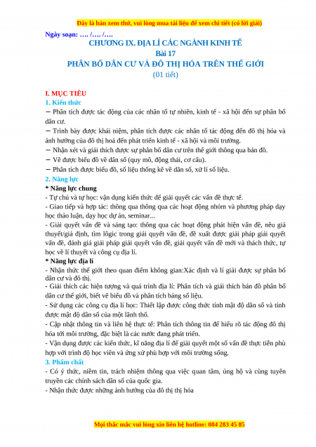 PHÂN BỐ DÂN CƯ VÀ ĐÔ THỊ HÓA TRÊN THẾ GIỚI (01 tiết) I. MỤC TIÊU 1. Kiến thức
