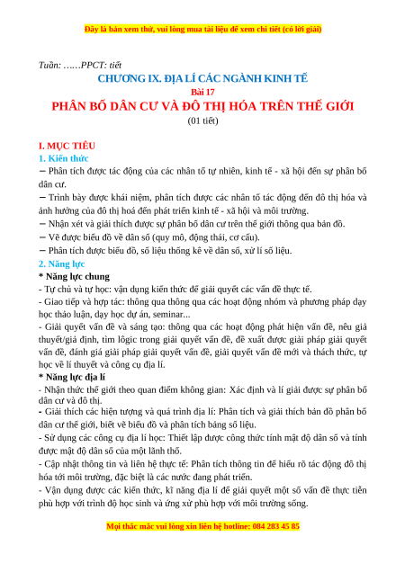 PHÂN BỐ DÂN CƯ VÀ ĐÔ THỊ HÓA TRÊN THẾ GIỚI (01 tiết) I. MỤC TIÊU 1. Kiến thức