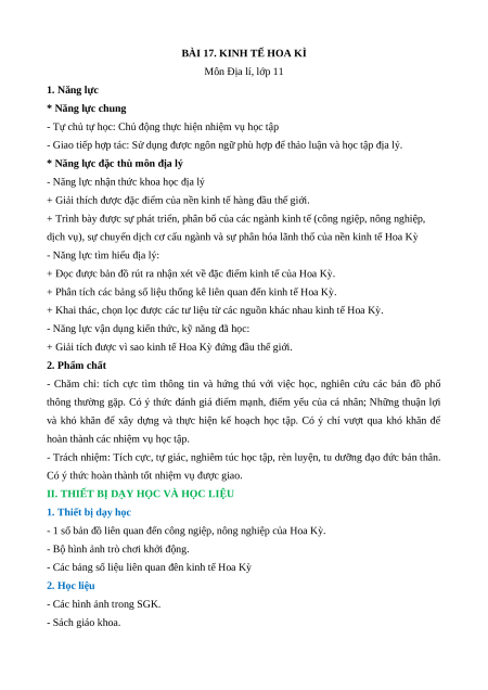 BÀI 17. KINH TẾ HOA KÌ Môn Địa lí, lớp 11 1. Năng lực * Năng lực chung