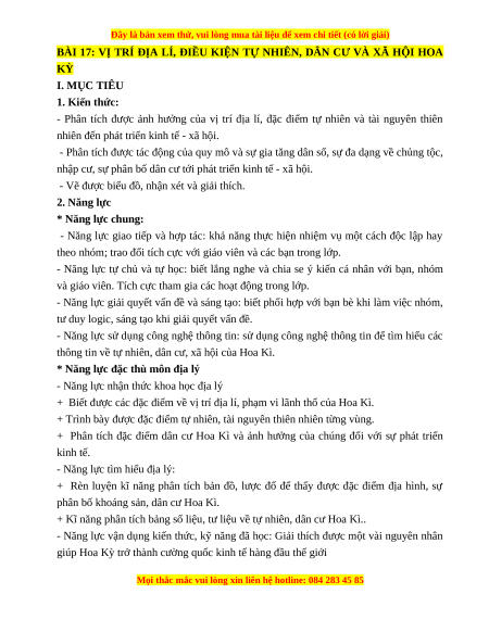 BÀI 17: VỊ TRÍ ĐỊA LÍ, ĐIỀU KIỆN TỰ NHIÊN, DÂN CƯ VÀ XÃ HỘI HOA KỲ I. MỤC TIÊU 1. Kiến thức: