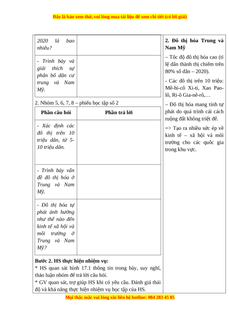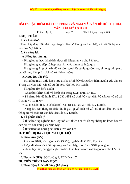 BÀI 17. ĐẶC ĐIỂM DÂN CƯ TRUNG VÀ NAM MỸ, VẤN ĐỀ ĐÔ THỊ HÓA,