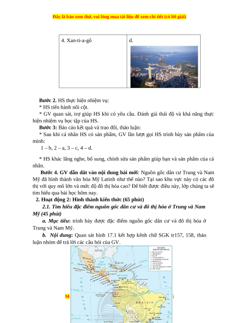 Giáo án Bài 17 Địa lí 7 Chân trời sáng tạo: Đặc điểm dân cư Trung và Nam Mỹ, văn đề đô thị hoá, văn hoá Mỹ Latinh