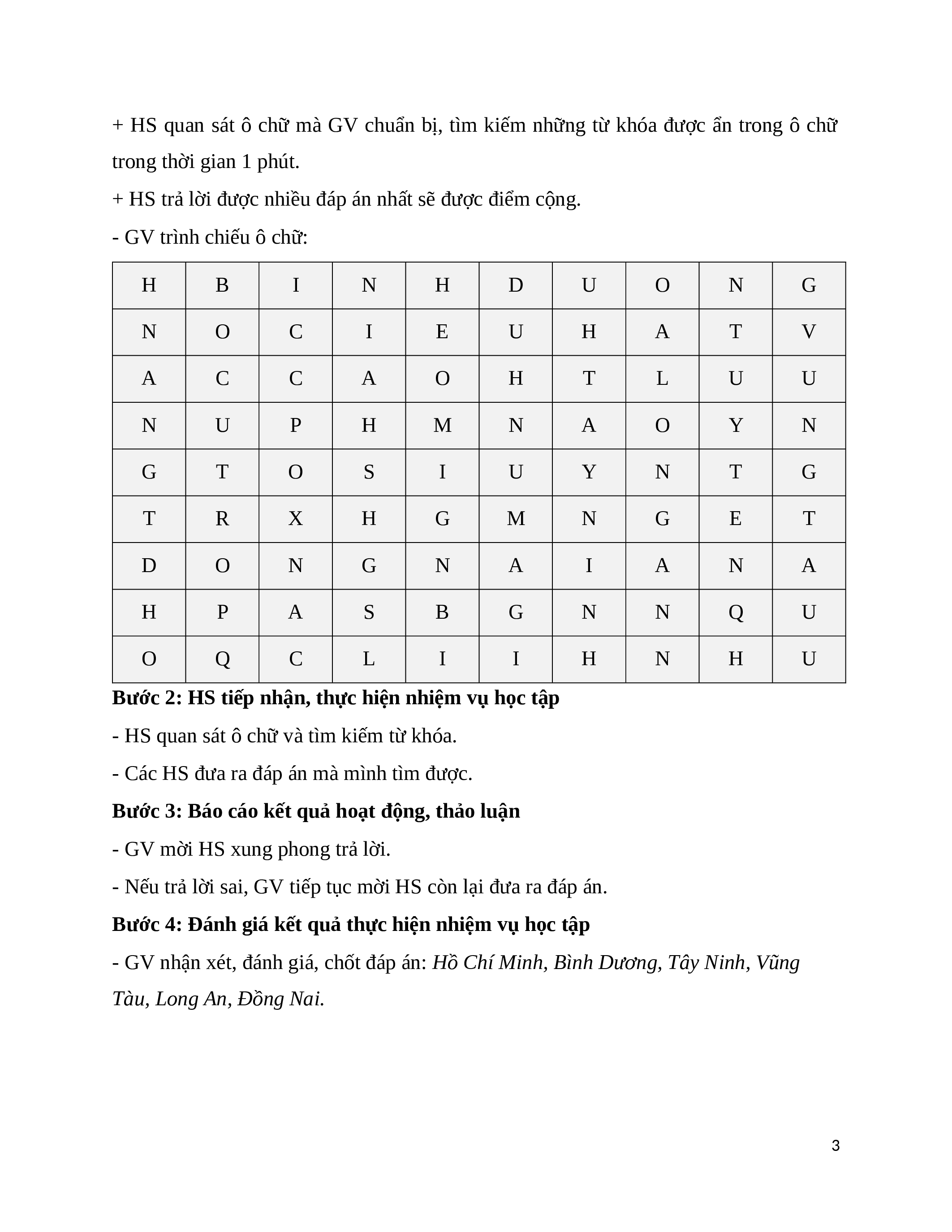 + HS trả lời được nhiều đáp án nhất sẽ được điểm cộng. - GV trình chiếu ô chữ: H B I N H D U O N G N O C I E U H A T V A C C A O H T L U U N U P H M N A O Y N G T O S I U Y N T G T R X H G M N G E T D O N G N A I A N A H P A S B G N N Q U O Q C L I I H N H U