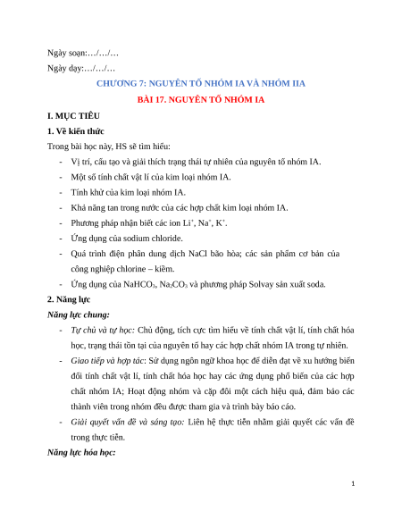 BÀI 17. NGUYÊN TỐ NHÓM IA I. MỤC TIÊU 1. Về kiến thức