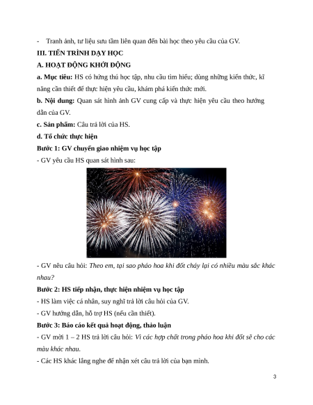 - GV nêu câu hỏi: Theo em, tại sao pháo hoa khi đốt cháy lại có nhiều màu sắc khác nhau?
