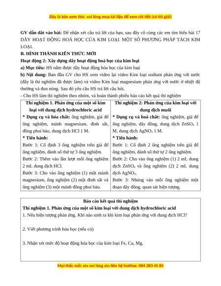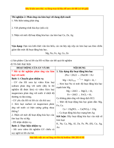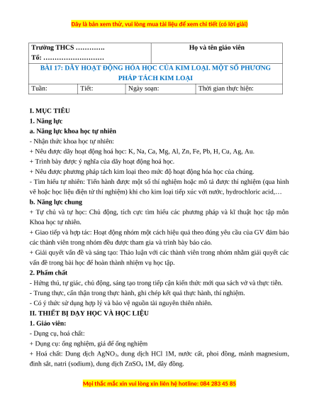 BÀI 17: DÃY HOẠT ĐỘNG HÓA HỌC CỦA KIM LOẠI. MỘT SỐ PHƯƠNG PHÁP TÁCH KIM LOẠI Tuần: Tiết: Ngày soạn: Thời gian thực hiện: I. MỤC TIÊU 1. Năng lực