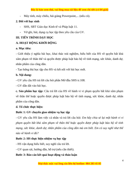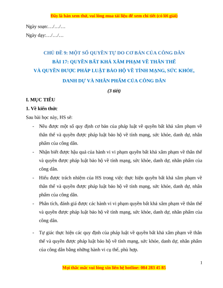 Giáo án Bài 17 KTPL 11 Kết nối tri thức: Quyền bất khả xâm phạm về thân thể và quyền được pháp luật bảo hộ về tính mạng, sức khỏe, danh dự, nhân phẩm của công dân