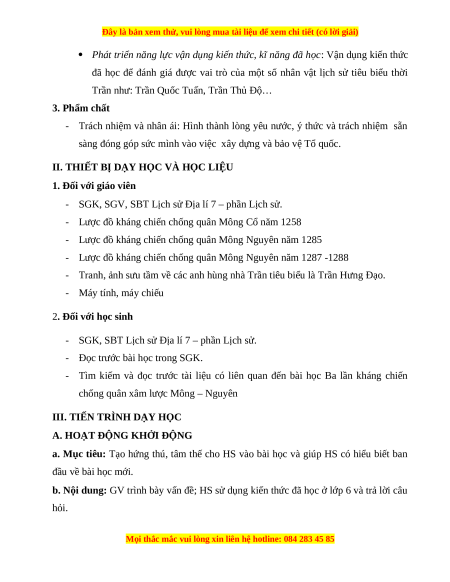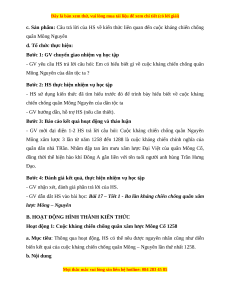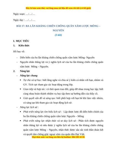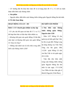 BÀI 17: BA LẦN KHÁNG CHIẾN CHỐNG QUÂN XÂM LƯỢC MÔNG – NGUYÊN (3 tiết) I. MỤC TIÊU 1. Kiến thức HS học về: