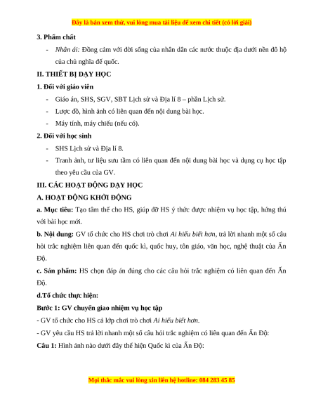 c. Sản phẩm: HS chọn đáp án đúng cho các câu hỏi trắc nghiệm có liên quan đến Ấn Độ.