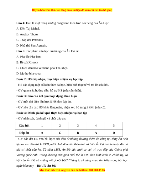 Câu 4: Đâu là một trong những công trình kiến trúc nổi tiếng của Ấn Độ? A. Đền Taj Mahal. B. Angkor Thom. C. Tháp đôi Petronas. D. Nhà thờ San Agustin.