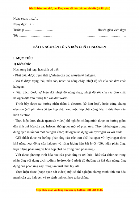 BÀI 17. NGUYÊN TỐ VÀ ĐƠN CHẤT HALOGEN I. MỤC TIÊU 1) Kiến thức