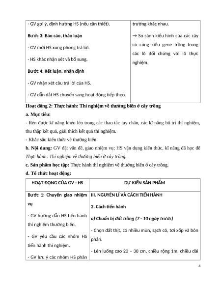 Hoạt động 2: Thực hành: Thí nghiệm về thường biến ở cây trồng a. Mục tiêu: