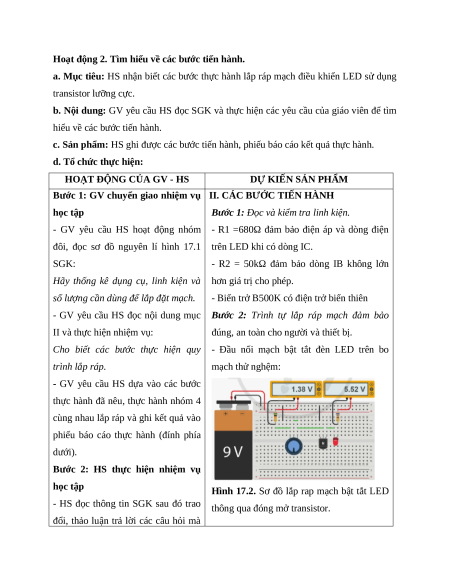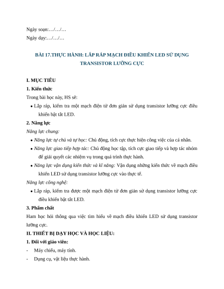 Lắp ráp, kiểm tra một mạch điện tử đơn giản sử dụng transistor lưỡng cực điều khiển bật tắt LED. 2. Năng lực Năng lực chung: