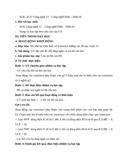 a. Mục tiêu: HS nhớ lại kiến thức về transistor lưỡng cực đã học ở bài 15.