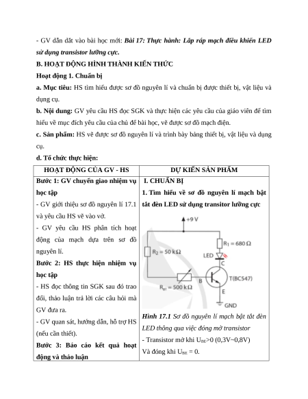 Giáo án Bài 17: Thực hành: Lắp ráp mạch điều khiển LED sử dụng transistor lưỡng cực (2024) Công nghệ Điện - Điện tử 12 Cánh diều