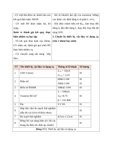 TT Tên thiết bị, vật liệu và dụng cụ Thông số kĩ thuật Số lượng ILED = 10mA 1 LED 5 (mm) 01 ULED = 2,2V 680Ω 1/4W 01 2 Điện trở 50kΩ 1/4W 01 3 Biến trở B500K 500kΩ 1/4W 01 IC = 100mA 4 Transitor BC547 UBE=0,7V 01 β = 110~800 5 Pin 9 V DC 01