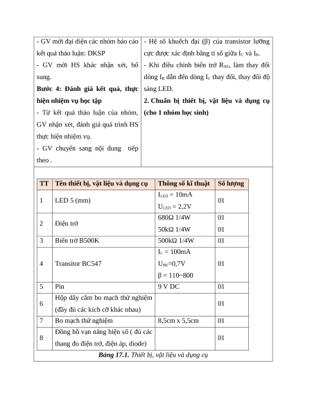 Bảng 17.1. Thiết bị, vật liệu và dụng cụ