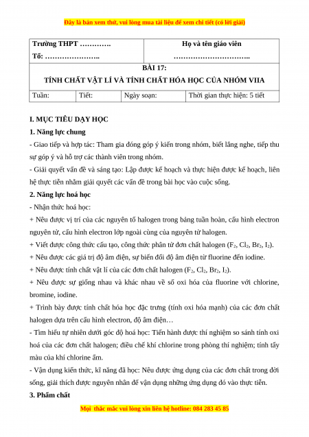 TÍNH CHẤT VẬT LÍ VÀ TÍNH CHẤT HÓA HỌC CỦA NHÓM VIIA Tuần: Tiết: Ngày soạn: