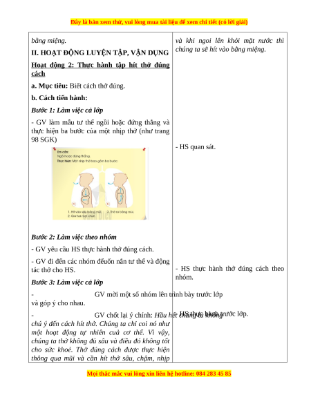 - Xác định được cách thở đúng. b. Cách tiến hành: Bước 1: Làm việc theo nhóm - GV yêu cầu HS
