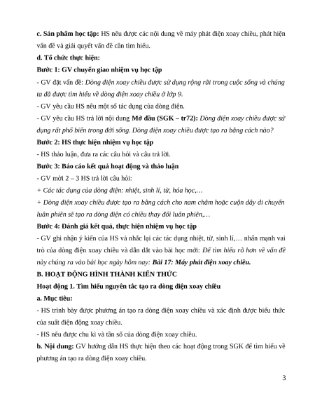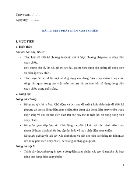 Giáo án Bài 17 Vật Lí 12 Kết nối tri thức (2025): Máy phát điện xoay chiều