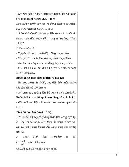 - Thảo luận để thiết kế phương án (hoặc mô tả được phương pháp) tạo ra dòng điện xoay chiều.