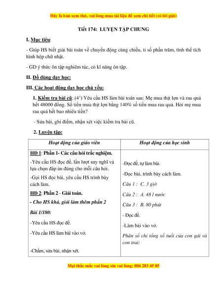 Giáo án Bài 174 Toán lớp 5: Luyện tập chung (Trang 180)