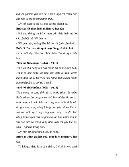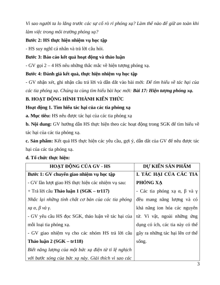 - GV yêu cầu HS đọc SGK, thảo luận về tác hại của tử. Vì vật, ngoài những ứng mỗi loại tia phóng xạ.