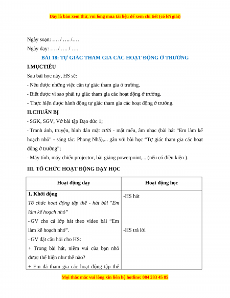 BÀI 18: TỰ GIÁC THAM GIA CÁC HOẠT ĐỘNG Ở TRƯỜNG I.MỤCTIÊU Sau bài học này, HS sẽ: