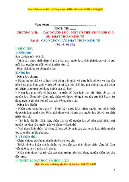 Bài 18: CÁC NGUỒN LỰC PHÁT TRIỂN KINH TẾ (Số tiết: 01 tiết) I. MỤC TIÊU 1. Kiến thức