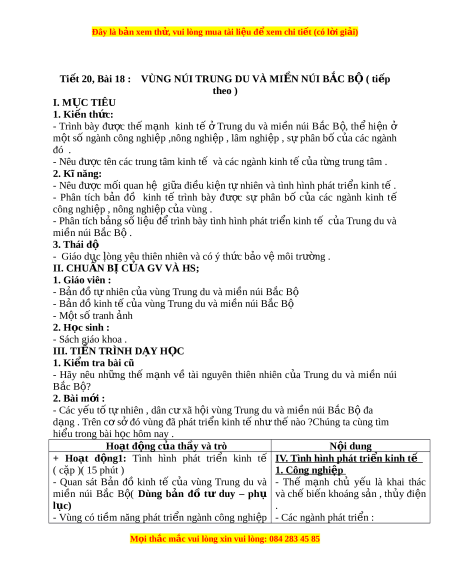 ể rình bày tình hình phát tri n ki ể nh t c ế a ủ Trung du và mi n núi ề B c B ắ ộ . 3. Thái đ ộ - Giáo d c ụ òng yêu t l hiên nhiên và có ý th c b ứ o v ả m ệ ôi trư ng . ờ II. CHUẨN BỊ C A Ủ GV VÀ HS; 1. Giáo viên : - B n