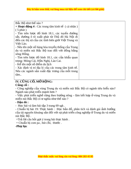 ấ phát từ Thủ đô Hà N i ộ đi đ n ế các th ịxã c a ủ các t nh ỉ biên gi i ớ Vi t ệ Trung và Việt Lào. - Nêu tên m t ộ số hàng hóa truy n t ề h ng c ố a ủ Trung du và mi n ề núi B c ắ Bộ trao đ i ổ v i ớ đ ng ồ b ng ằ sông Hồng. - Tìm trên lư c ợ đồ hình 18.1, các c a ử kh u ẩ quan tr ng: ọ Móng Cái, H u N ữ gh , L ị ào Cai. - K t ể ên m t ộ số đi m ể du lịch - Xác đ nh ị vị trí đ a ị lý c a ủ các trung tâm kinh t . ế Nêu các ngành s n ả xu t ấ đ c ặ tr ng ư c a ủ m i ỗ trung tâm.. IV. C N Ủ G C , M Ố R Ở N Ộ G: Củng cố : - Công nghi p ệ c a ủ vùng Trung du và mi n ề núi B c ắ Bộ có ngành tiêu bi u ể nào? Ngành nào phát tri n m ể nh ạ h n ? ơ - Vi c ệ phát tri n ể nghề r ng ừ theo hư ng ớ nông – lâm k t ế h p ợ ở vùng Trung du và mi n núi ề B c B ắ ộ có nghĩ ư a như thế nào ? - Dặn dò : - H c bài ọ và làm bài t p 3 t ậ rang 69 sgk . - Chu n ẩ bị bài 19: Th c ự hành : Đ c ọ b n ả đ ,