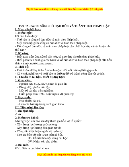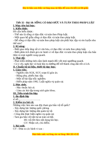 ế phân tích đánh giá các hành vi v đ ề o ạ đ c và t ứ uân theo pháp lu t ậ c a ủ b n ả thân và m i ọ ngư i ờ xung quanh. 3. Thái đ : ộ - Phát tri n nh ể ng ữ tình c m ả lành m nh đ ạ i ố v i ớ m i ọ ngư i ỡ ug quanh. - Có ý chí, ngh l ị c và ự hoài bão tu dư ng đ ỡ t ể r t ở hành công dân t t ố có ích. I I. Chu n b ẩ ị t ài li u, t ệ hi t ế b d ị y h ạ c ọ : 1. Giáo viên: - Nghiên c u SG ứ K, SGV, so n kĩ ạ giáo án. - B ng ả ph , phi ụ u h ế c t ọ p. ậ - M t ộ số bài t p t ậ r c nghi ắ m ệ . - Hi n pháp năm ế 1992. Lu t ậ nghĩa v quân ụ s . ự 2. H c ọ sinh: - H c ọ thu c bài ộ cũ. - Làm các bài t p t ậ rong sách giáo khoa. I I I . Ti n t ế rình lên l p: ớ 1. n ổ đ nh l ị p ớ