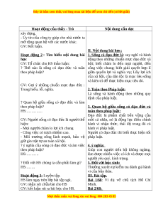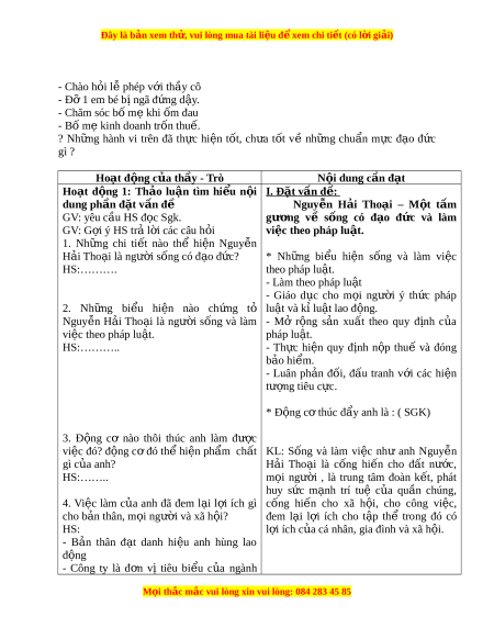 ộ I . Đặt vấn đề : dung ph n đ ầ t ặ v n đ ấ ề Nguy n ễ H i ả Tho i ạ – M t ộ t m ấ GV: yêu cầu HS đ c Sgk. ọ gư ng ơ về s ng ố có đ o ạ đ c ứ và làm GV: G i ợ ý HS tr l ả i ờ các câu h i ỏ vi c t ệ heo pháp lu t ậ . 1. Nh ng ữ chi ti t ế nào thể hi n ệ Nguy n ễ H i ả Tho i ạ là ngư i ờ s ng có đ ố o đ ạ c? ứ * Nh ng ữ bi u ể hi n ệ s ng ố và làm vi c ệ HS:………. theo pháp lu t ậ . - Làm theo pháp lu t ậ - Giáo d c ụ cho m i ọ ngư i ờ ý th c ứ pháp 2. Nh ng ữ bi u ể hi n ệ nào chứng tỏ lu t ậ và kỉ lu t ậ lao động. Nguy n ễ H i ả Tho i ạ là ngư i ờ s ng ố và làm - Mở r ng ộ s n ả xu t ấ theo quy đ nh ị c a ủ việc theo pháp lu t ậ . pháp lu t ậ . HS:……….. - Th c ự hi n ệ quy đ nh ị n p ộ thuế và đóng b o hi ả m ể . - Luân ph n ả đ i ố , đ u ấ tranh v i ớ các hi n ệ tư ng t ợ iêu c c. ự * Đ ng c ộ ơ thúc đ y anh ẩ là : ( SGK) 3. Đ ng