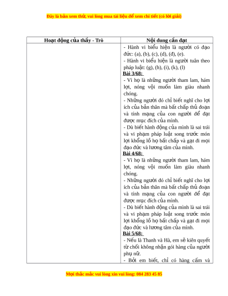 ứ (a), (b), (c), (d), (đ), (e). - Hành vi bi u ể hi n ệ là ngư i ờ tuân theo pháp lu t ậ : (g), (h), (i), (k), (l) Bài 3/68: - Vì họ là nh ng ữ ngư i ờ tham lam, hám l i ợ , nóng v i ộ mu n ố làm giàu nhanh chóng. - Nh ng ữ ngư i ờ đó chỉ bi t ế nghĩ cho l i ợ ích c a ủ b n ả thân mà b t ấ ch p ấ th ủ đo n ạ và tính m ng ạ c a ủ con ngư i ờ để đ t ạ đư c m ợ c ụ đích c a m ủ ình. - Dù bi t ế hành đ ng ộ c a ủ mình là sai trái và vi ph m ạ pháp lu t ậ song trư c ớ món l i ợ khổng lồ họ b t ấ ch p ấ và g t ạ đi m i ọ đ o đ ạ c ứ và lư ng t ơ âm c a ủ mình. Bài 4/68: - Vì họ là nh ng ữ ngư i ờ tham lam, hám l i ợ , nóng v i ộ mu n ố làm giàu nhanh chóng. - Nh ng ữ ngư i ờ đó chỉ bi t ế nghĩ cho l i ợ ích c a ủ b n ả thân mà b t ấ ch p ấ th ủ đo n ạ và tính m ng ạ c a ủ con ngư i ờ để đ t ạ đư c m ợ c ụ đích c a m ủ ình. - Dù bi t ế hành đ ng ộ c a ủ mình là sai trái và vi ph m ạ pháp lu t ậ song trư c ớ món l i ợ khổng lồ họ b t ấ ch p ấ và g t ạ đi m i ọ đ o đ ạ c ứ và lư ng t ơ âm c a ủ mình. Bài 5/68: - N u ế là Thanh và Hà, em s ẽ kiên quy t ế từ chối không nh n ậ gói hàng c a ủ ngư i ờ ph n ụ . ữ - B i ở em bi t ế , chỉ có hàng c m ấ và M i ọ thắc m c