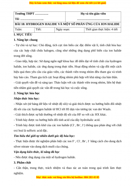 BÀI 18: HYDROGEN HALIDE VÀ MỘT SỐ PHẢN ỨNG CỦA ION HALIDE Tuần: Tiết: Ngày soạn: