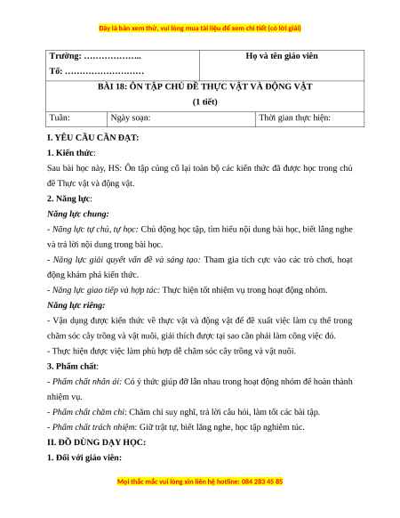BÀI 18: ÔN TẬP CHỦ ĐỀ THỰC VẬT VÀ ĐỘNG VẬT (1 tiết) Tuần: Ngày soạn: Thời gian thực hiện: