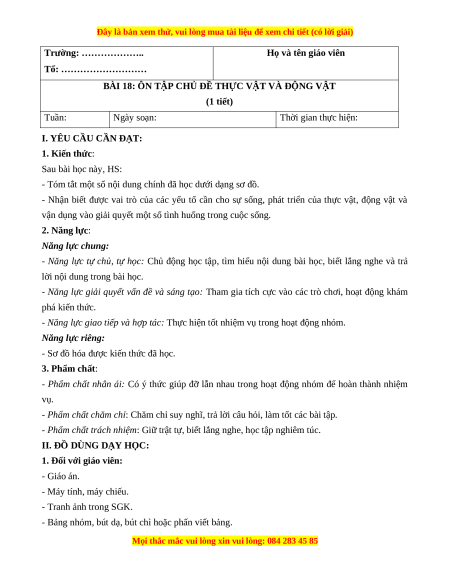 BÀI 18: ÔN TẬP CHỦ ĐỀ THỰC VẬT VÀ ĐỘNG VẬT (1 tiết) Tuần: Ngày soạn: Thời gian thực hiện: I. YÊU CẦU CẦN ĐẠT: 1. Kiến thức: Sau bài học này, HS: